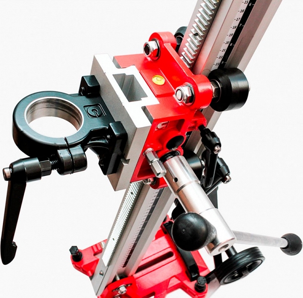 - Каретка перемещается по стойке вручную через пару "шестерня-зубчатая рейка", имеет регулируемые уголки из латуни, которые обеспечивают плавное скольжение и легкую подачу алмазной коронки
