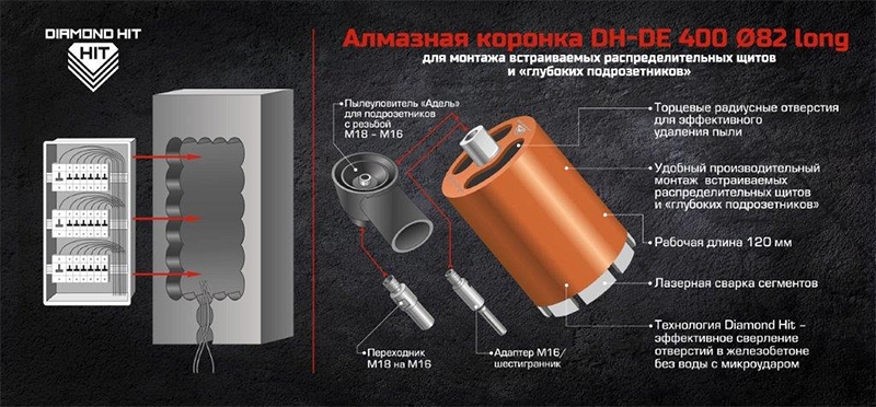 Преимущества алмазной коронки с пылеудалением для сухого сверления подрозетников с микроударом Адель Diamond Hit DH-DE400 Long 82/120 мм:
