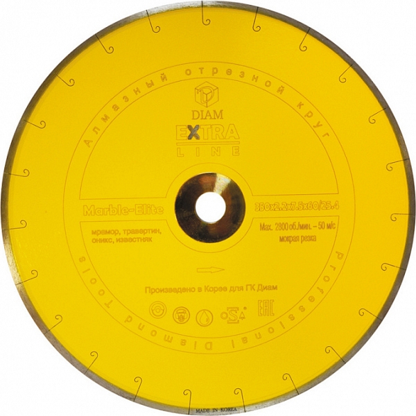 Алмазный отрезной круг Diam Extra Line 1A1R Корона Marble-Elite 350 мм (Диам Экстра Лайн 1А1Р Корона Марбл-Элит 350 мм) – профессиональный алмазный диск специального назначения для высокопроизводительной мокрой резки мрамора, оникса, травертина, известняка на бензорезах, электрических резчиках, настольных камнерезных станках, стенорезных машинах, швонарезчиках и промышленном оборудовании с подачей воды.