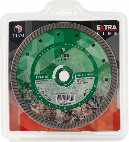 Алмазный отрезной круг Diam Extra Line Turbo Гранит 180 мм (Диам Экстра Лайн Турбо Гранит 180 мм) – специальный алмазный диск тип Turbo для сухой резки гранитов, базальта, сланца и других твердых материалов.