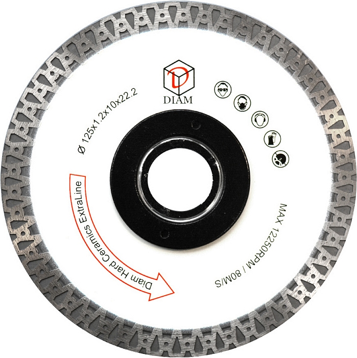 Алмазный отрезной круг Diam Extra Line Turbo Hard Ceramics 125 мм (Диам Экстра Лайн Турбо Хард Керамикс 125 мм) – специальный профессиональный тонкий алмазный диск со сплошной турбированной режущей кромкой для сухой чистовой резки гранита, мрамора, керамогранита, керамики, расшивки швов между плитой.