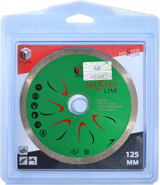 Алмазный отрезной круг Diam Master Line 1A1R Корона Granite 125 мм (Диам Мастер Лайн 1А1Р Корона Гранит 125 мм) – универсальный недорогой алмазный диск высокого качества со сплошной режущей кромкой для резки гранитной, мраморной и керамической плитки болгарками (ушм), штроборезами и системами резки крупноформатной плитки с подачей воды.