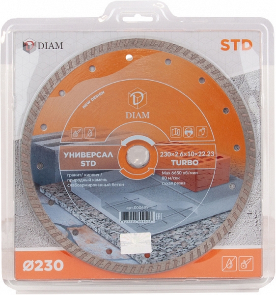 Алмазный отрезной круг Diam STD Turbo Универсал 230 мм (Диам СТД Турбо Универсал 230 мм) – универсальный алмазный отрезной диск тип turbo для сухой резки гранита, кирпича, природного камня, слабоармированного бетона (железобетона) на ручных углошлифовальных машинах (ушм, болгарках), штроборезах, системах резки крупноформатной плитки, бензорезах, электрических резчиках и плиткорезах, ручных стенорезных машинах без водяного охлаждения.