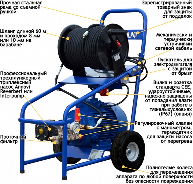 - Профессиональный надежный насос высокого давления с керамическими плунжерами Annovi Reverberi (Италия) и электродвигатель с защитой от перегрузки повышают эффективность очистки и надежность эксплуатации