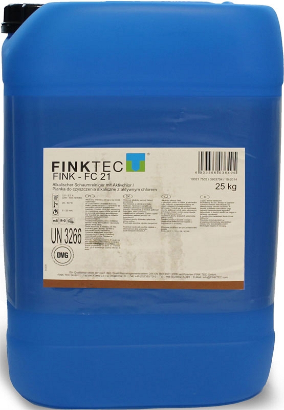 Концентрированное щелочное моющее средство Finktec FINK-FC 21 (Финктек ФИНК-ФЦ 21) с активным хлором – прозрачная, светлобежевая, немного вязкая жидкость эффективно удаляет белок и жир, чистит и дезинфицирует, стабилизирует жесткость воды, без фосфата. Пенное щелочное моющее средство, содержащее активный хлор, для промывки всего оборудования на пищевых предприятиях. Поверхности из металла, керамики и искусственных материалов основательно очищаются от бактерий, благодаря комбинации активных веществ. Выраженная стабильность пенообразования способствует удалению жировых и белковых загрязнений.