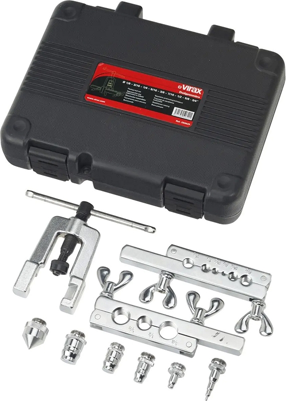 Набор инструментов для развальцовки и расширения труб Virax 1/8"-3/16"-1/4"-5/16"-3/8"-7/16"-1/2"-5/8"-3/4" (Виракс 1/8"-3/16"-1/4"-5/16"-3/8"-7/16"-1/2"-5/8"-3/4") предназначен для формирования сужающихся фланцев под 45° труб Ø 1/8", 3/16", 1/4", 5/16", 3/8", 7/16", 1/2", 5/8", 3/4" и расширения труб Ø 3/16", 1/4", 5/16", 3/8", 1/2", 5/8", 3/4" из мягкой меди, алюминия и латуни.