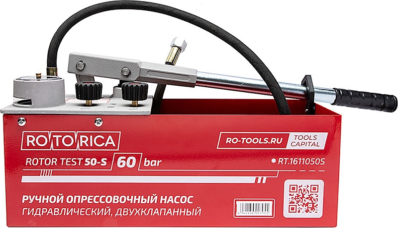 Ручной опрессовщик Rotorica Rotor Test 50-S (Роторика Ротор Тест 50-С) – двухклапанный испытательный насос для проверки на герметичность давлением до 60 бар контуров отопительных, холодильных, спринклерных систем; гидравлических испытаний систем отопления, водоснабжения, солнечных коллекторов, резервуаров и т.д.; быстрой ручной опрессовки систем отопления; проверки на утечку отопительных и воздушных контуров, холодильных систем, масляных и спринклерных систем и многих других трубных установок; ежедневного профессионального использования.