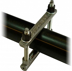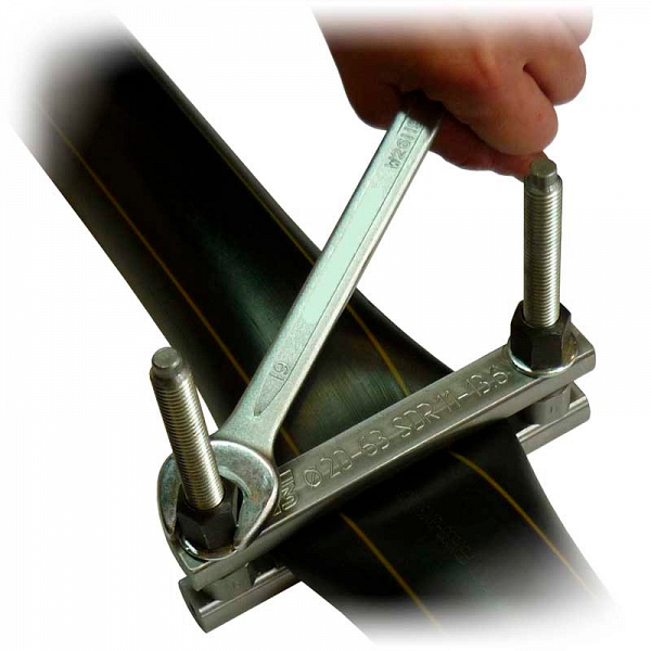 - Пережимное устройство со снятой верхней штангой имеет форму П-образной скобы, которая легко устанавливается на трубу даже в самом труднодоступном месте. После установки верхней штанги затягивают две гайки любым ключом 19 мм. Движение верхней штанги отграничено двумя сменными маркированными ограничителями на шпильках. Правильный выбор ограничителей (см. таблицу на деревянной коробке) гарантирует герметичное перекрытие пластиковой трубы при отсутствии необратимых повреждений ее стенок.