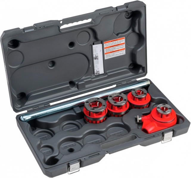 - Все резьбонарезные наборы оснащены универсальной ручной трещоткой, позволяющей крутить резьбонарезные головки в сборе от 1/8" до 2". На фиксаторе резьбонарезной головки указано направление вперед и назад. Резьбонарезные головки вставляются с обеих сторон, защелкиваются в трещотке и вынимаются отщелкиванием кнопки