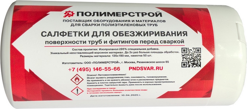 Салфетки для обезжиривания ПЭ труб и фитингов перед сваркой Gas Fusion, 50 шт. (Газ Фьюжин, 50 шт.) с содержанием изопропанола 95% применяют для обезжиривания поверхности фитингов и ПНД труб перед раструбной муфтовой и электромуфтовой сваркой для удаления загрязнений, которые снижают прочность стыка, при монтаже коммуникаций.