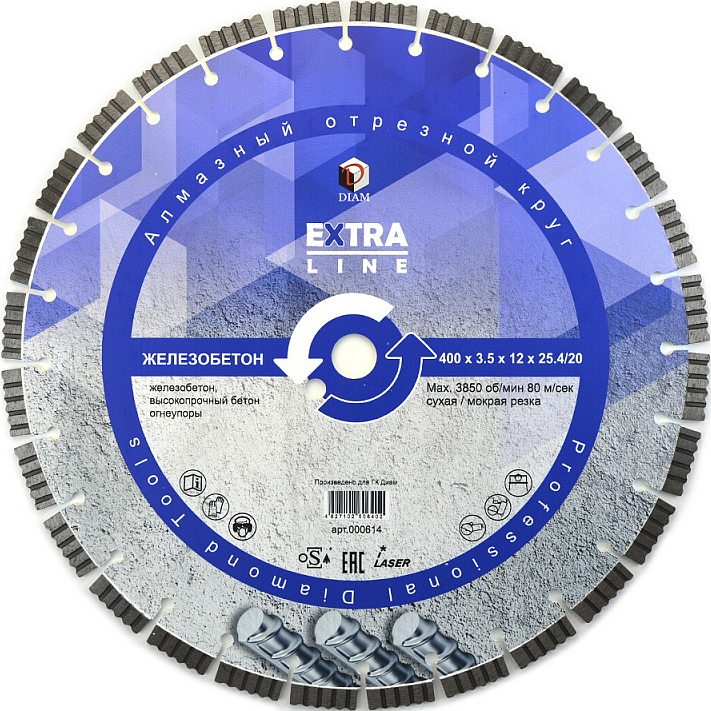 Сегментный алмазный круг Diam Extra Line 1A1RSS Turbo Железобетон 400 мм (Диам Экстра Лайн 1А1РСС Турбо Железобетон 400 мм) – профессиональный алмазный отрезной диск с лазерной сваркой сегментов для сухой и мокрой резки железобетона, старого высокопрочного бетона, клинкера, огнеупоров и других твердых материалов на бензорезах, электрических резчиках, камнерезных станках, стенорезных машинах, швонарезчиках, как с водяным охлаждением, так и без.