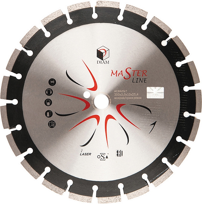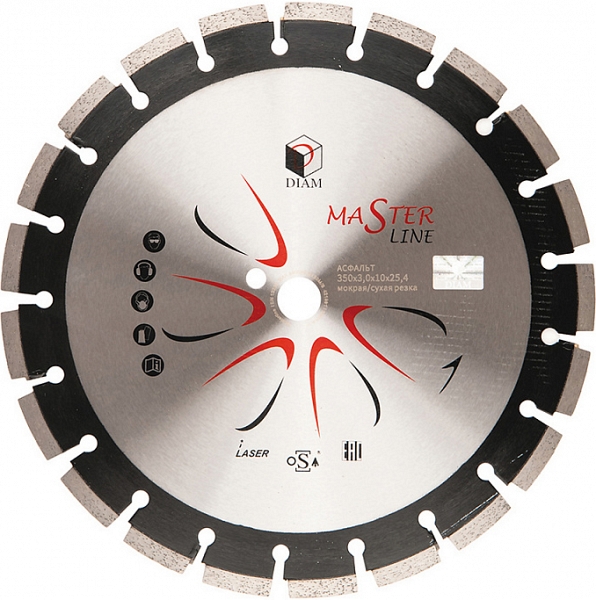 Сегментный алмазный круг Diam Master Line 1A1RSS Асфальт 350 мм (Диам Мастер Лайн 1А1РСС Асфальт 350 мм) – специальный алмазный отрезной диск с лазерной сваркой сегментов для сухой и мокрой резки асфальта, асфальтобетона, пенобетона, абразивного песчаника, кирпича и других абразивов на резчиках швов, стенорезных машинах, бензорезах, электрических резчиках, камнерезных станках, как с подачей воды, так и без нее.