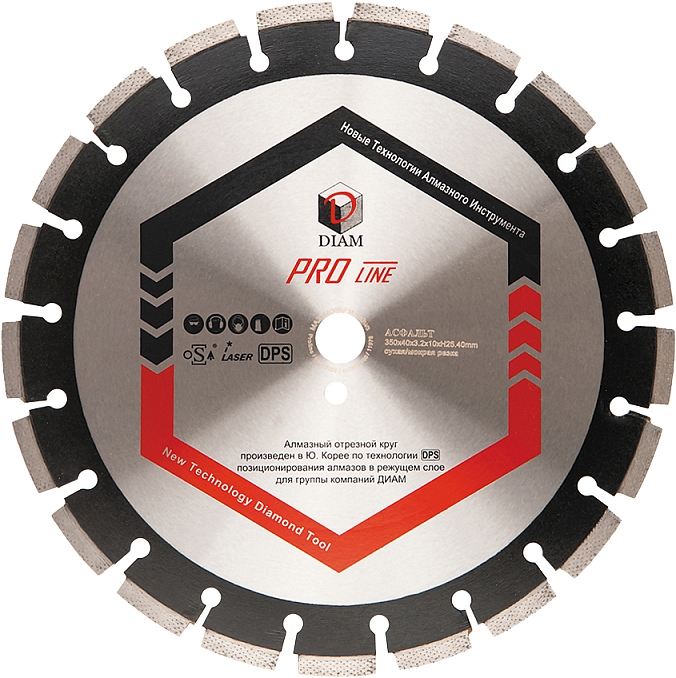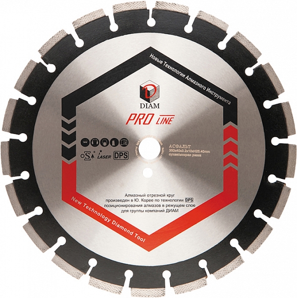 Сегментный алмазный круг Diam Pro Line 1A1RSS Асфальт 350 мм (Диам Про Лайн 1А1РСС Асфальт 350 мм) – профессиональный алмазный отрезной диск с лазерной сваркой сегментов, произведенный по технологии DPS (позиционирования алмазов в режущем слое), для сухой и мокрой резки асфальта с тяжелым наполнителем, асфальтобетона, абразивного песчаника, кирпича и других абразивов на резчиках швов, стенорезных машинах, бензорезах, электрических резчиках, камнерезных станках и другом оборудовании, как с водяных охлаждением, так и без него.
