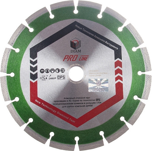 Сегментный алмазный круг Diam Pro Line 1A1RSS Laser Гранит 230 мм (Диам Про Лайн 1А1РСС Лазер Гранит 230 мм) – профессиональный алмазный отрезной диск, произведенный по технологии DPS – позиционирования алмазов в режущем слое, для сухой и мокрой резки гранита, кварца, твердых песчаников на ручном электроинструменте (углошлифовальных машинах, ушм, болгарках, штроборезах, системах резки крупноформатной плитки, бензорезах, электрических резчиках, ручных стенорезных машинах) и плиткорезах электрических, как с подачей охлаждающей жидкости, так и без.