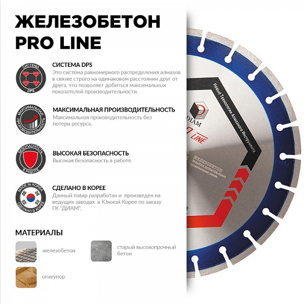 Сегментный алмазный круг Diam Pro Line 1A1RSS Железобетон 230 мм (Диам Про Лайн 1А1РСС Железобетон 230 мм) – профессиональный алмазный отрезной диск с лазерной сваркой сегментов, произведенный по технологии DPS – позиционирования алмазов в режущем слое, для сухой и мокрой резки железобетона, старого высокопрочного бетона, огнеупоров на ручном электроинструменте (углошлифовальных машинах, ушм, болгарках, штроборезах, системах резки крупноформатной плитки, бензорезах, электрических резчиках, ручных стенорезных машинах) и плиткорезах электрических, как с охлаждением, так и без.
