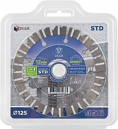 Сегментный алмазный круг Diam STD 1A1RSS Turbo Железобетон 125 мм (Диам СТД 1А1РСС Турбо Железобетон 125 мм) – профессиональный алмазный отрезной диск для сухой резки железобетона, бетона, камня, кирпича на ручном электроинструменте без водяного охлаждения, в том числе на аккумуляторной технике.