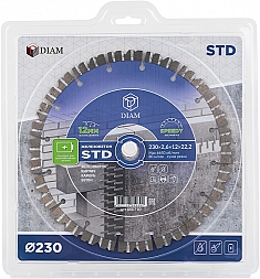 Сегментный алмазный круг Diam STD 1A1RSS Turbo Железобетон 230 мм (Диам СТД 1А1РСС Турбо Железобетон 230 мм) – профессиональный алмазный отрезной диск для сухой резки железобетона, бетона, камня, кирпича на ручном электроинструменте без водяного охлаждения, в том числе на аккумуляторной технике и плиткорезах электрических.