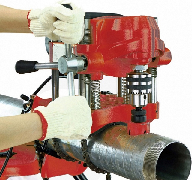 - Привод мощностью 1,5 кВт с червячным редуктором создает высокую мощность для вырезания отверстий в тонкостенных и толстостенных трубах