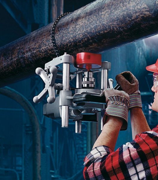 - Приводной двигатель с червячным редуктором на 13 А, 1,8 кВт создает бесподобную мощность при вырезании отверстий для тонко- и толстостенных труб
