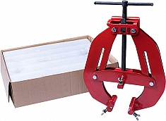 - Окрашенная, разборная, струбцинная, прочная стальная конструкция повышенной прочности из кованной стали состоит из стальной рамы с 2-мя ножками с направляющими прорезями и верхнего прижима с затяжным винтом, которые регулируют охват основных труб, и вкручиваемых в них лепестковых винтов из нержавеющей стали с пружинами для центрирования подсоединяемых труб и элементов: легкий монтаж, надежность и безопасности использования