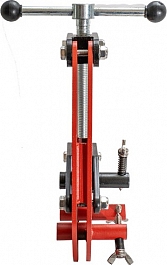 - Конструкция состоит из стальной рамы с 2-мя ножками с регулировочными винтами и верхнего прижима с затяжным винтом, которые регулируют размер охватываемых труб с лапкой и винтом центровки