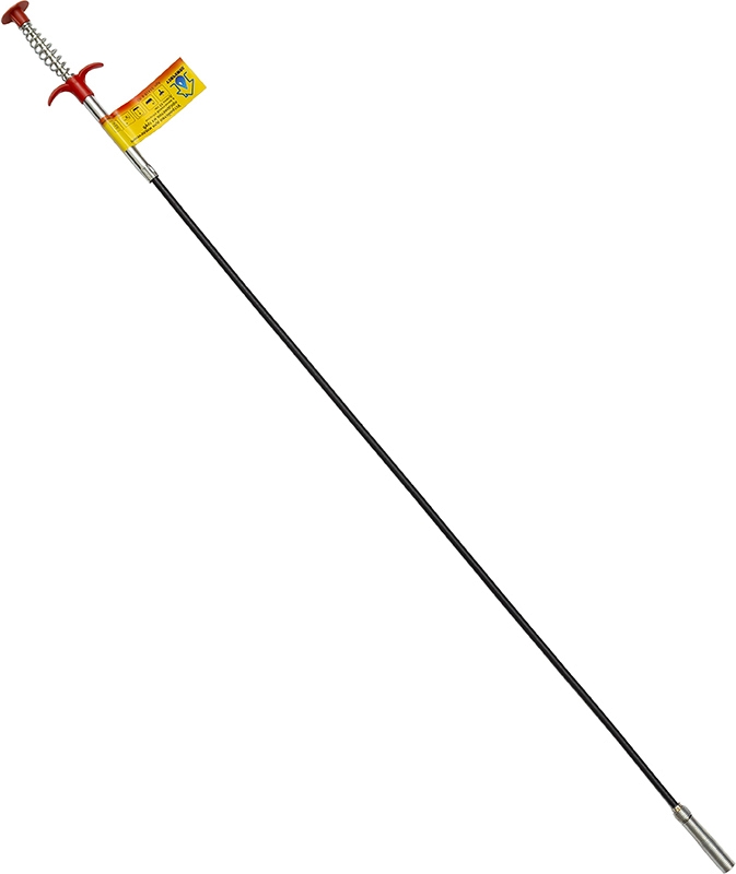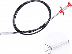 - Металлическая спираль 90 см в виниловой оплетке с насадкой зажимом и рукояткой с кнопкой позволяют извлекать предметы из сливов, труб и других узких мест
