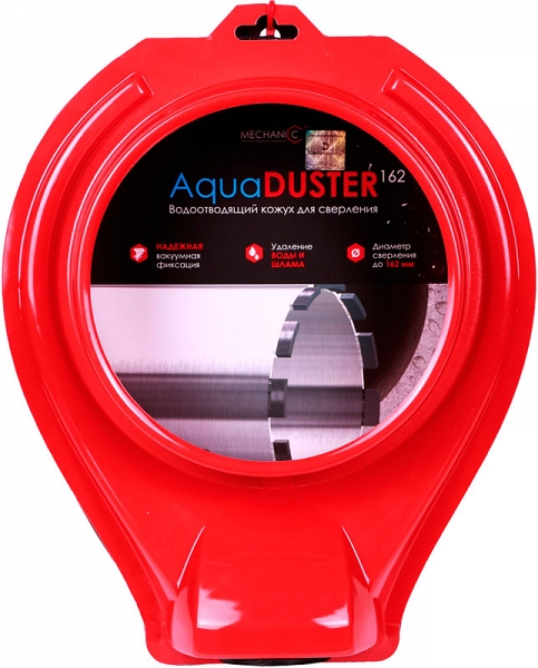 Водосборное кольцо для алмазного бурения Mechanic AquaDuster 162 (Механик АкваДастер 162) предназначено для сбора и отвода воды со шламом при алмазном сверлении отверстий Ø до 162 мм ручными дрелями и установками алмазного бурения и другой специальной алмазной техникой с подачей воды с применением строительного или промышленного пылесоса. При сверлении бетонных, кирпичных стен алмазными кольцевыми сверлами (коронками), одной из больших сложностей является вода, шлам и грязь. Особенно это важно если сверление ведут в помещении с ремонтом. На помощь приходит коллектор для сбора воды Mechanic AquaDuster 162 – приспособление для отвода пыли и охлаждающей жидкости из зоны контакта алмазной коронки или сверла с обрабатываемым материалом